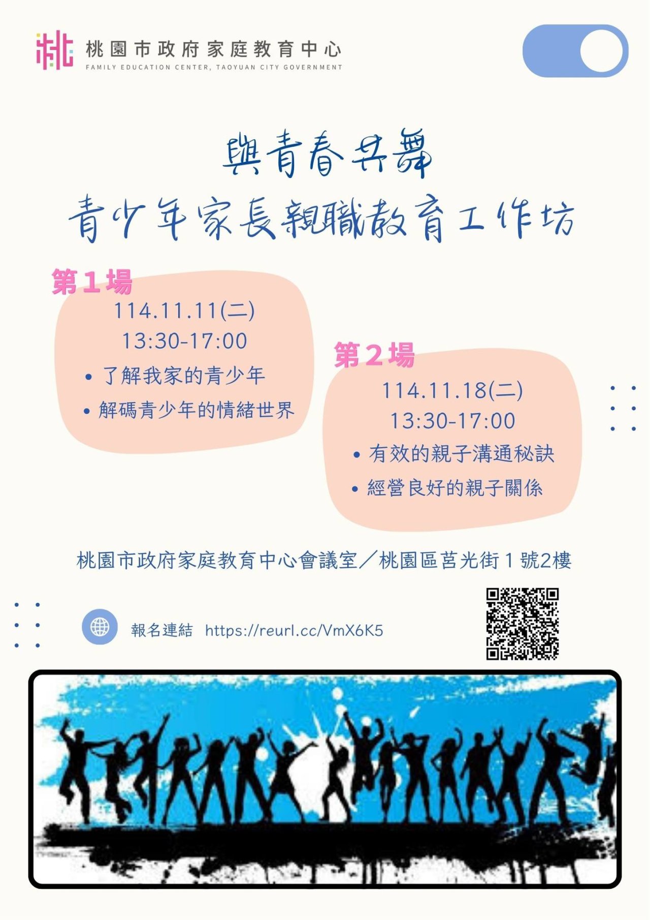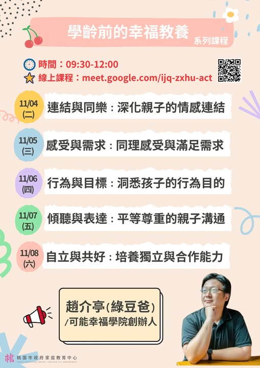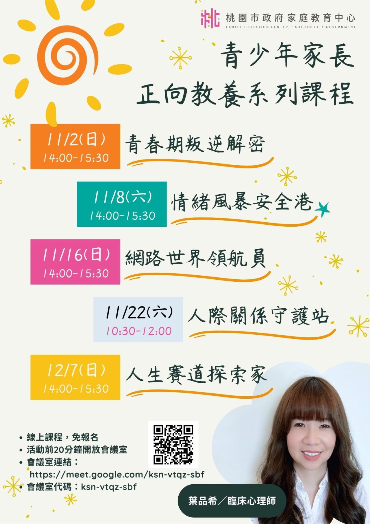 | 二、 | 旨揭課程詳細資訊,請見中心課程行事曆(https://reurl.cc/xlGyGL)或追蹤「桃園市政府家庭教育中心」FB粉絲專頁;另倘有家庭教育個別化服務需求,可撥打4128185家庭教育諮詢專線,本市市民可申請小桃家線上諮詢室(預約連結:https://reurl.cc/oZWOY5),由中心媒合專業人員透過線上會議室提供服務。 |