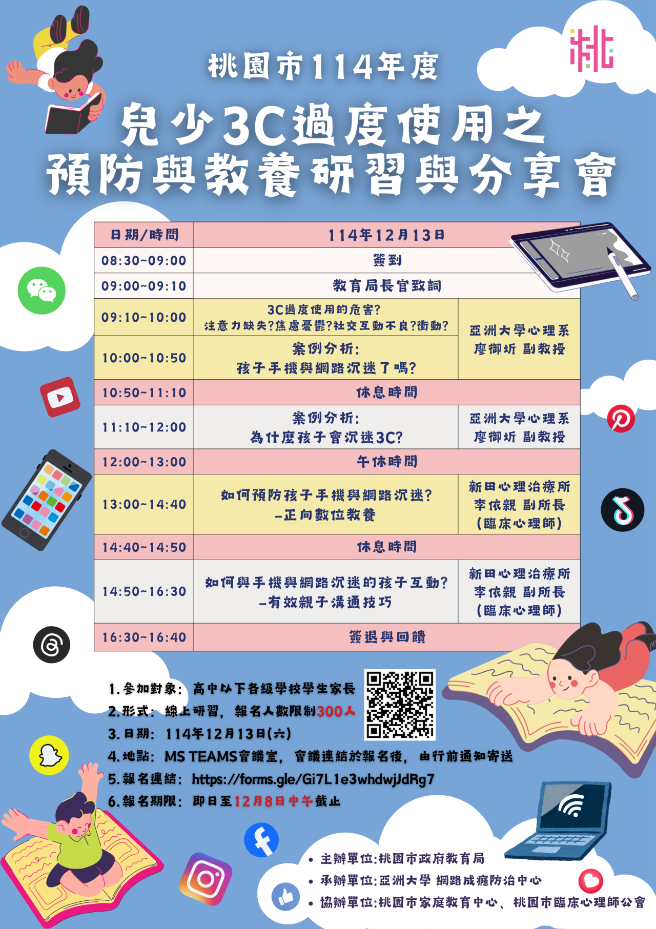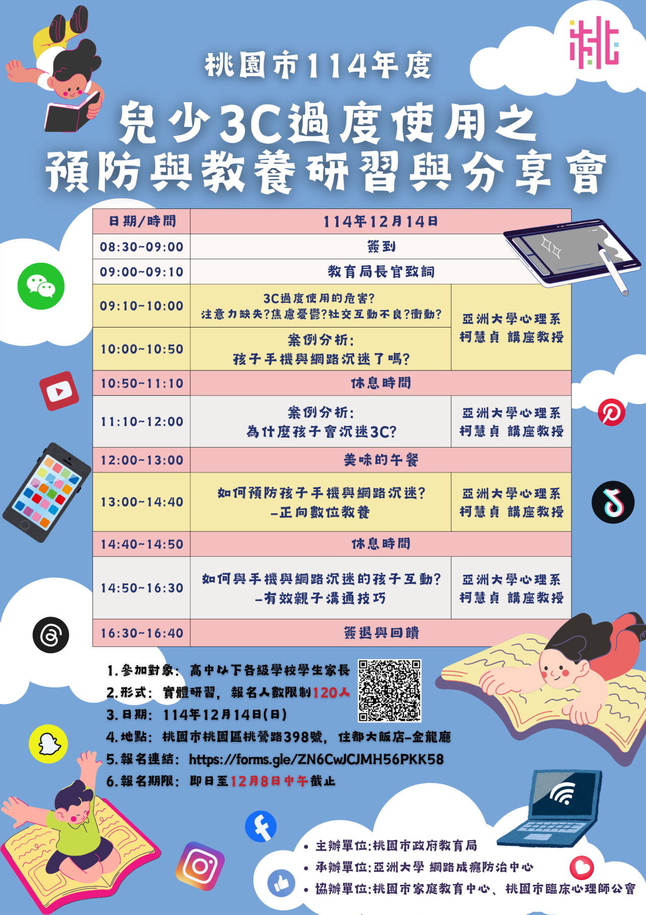| 二、 | 隨著科技融入生活,過度使用3C可能影響孩子的身心發展、專注力、人際互動及作息品質。為協助家長更全面了解3C使用對孩子的影響,並掌握有效的家庭教養策略,114年度本局與亞洲大學合作辦理旨揭分享會,透過案例分析與互動交流,找到更適合自己孩子的教養方式。 |