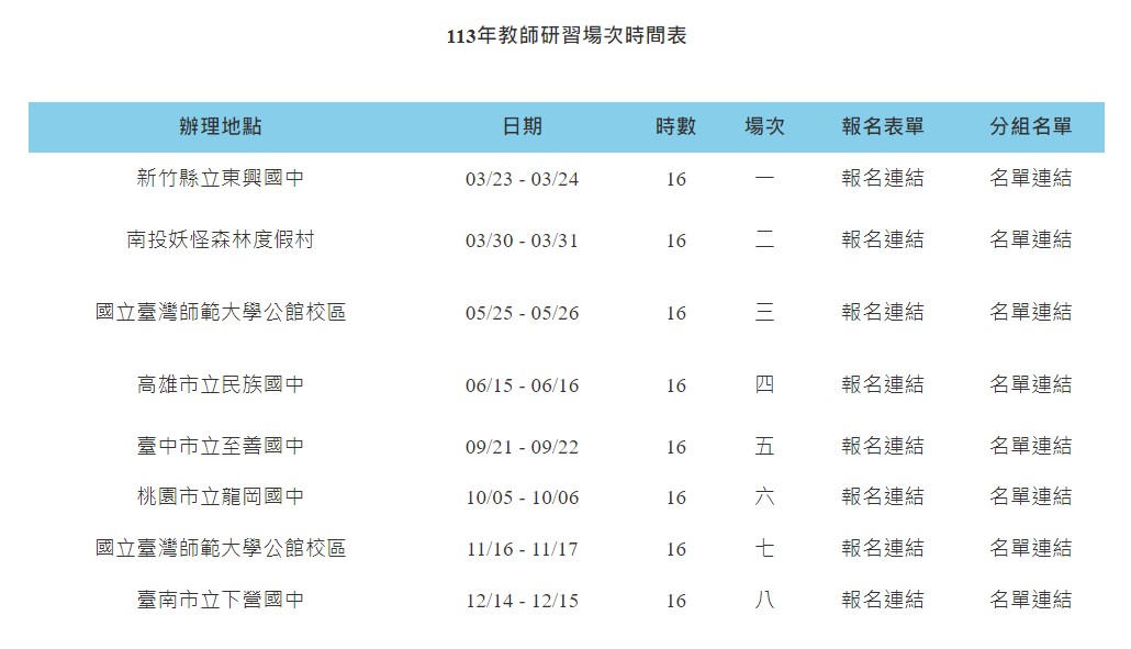 | 3、 | 第三場次師大1場:113年5月25日(星期六)至5月26日(星期日);研習地點:師大公館校區;報名連接:https://forms.gle/B49MSNDVbgDv67w29 。 |