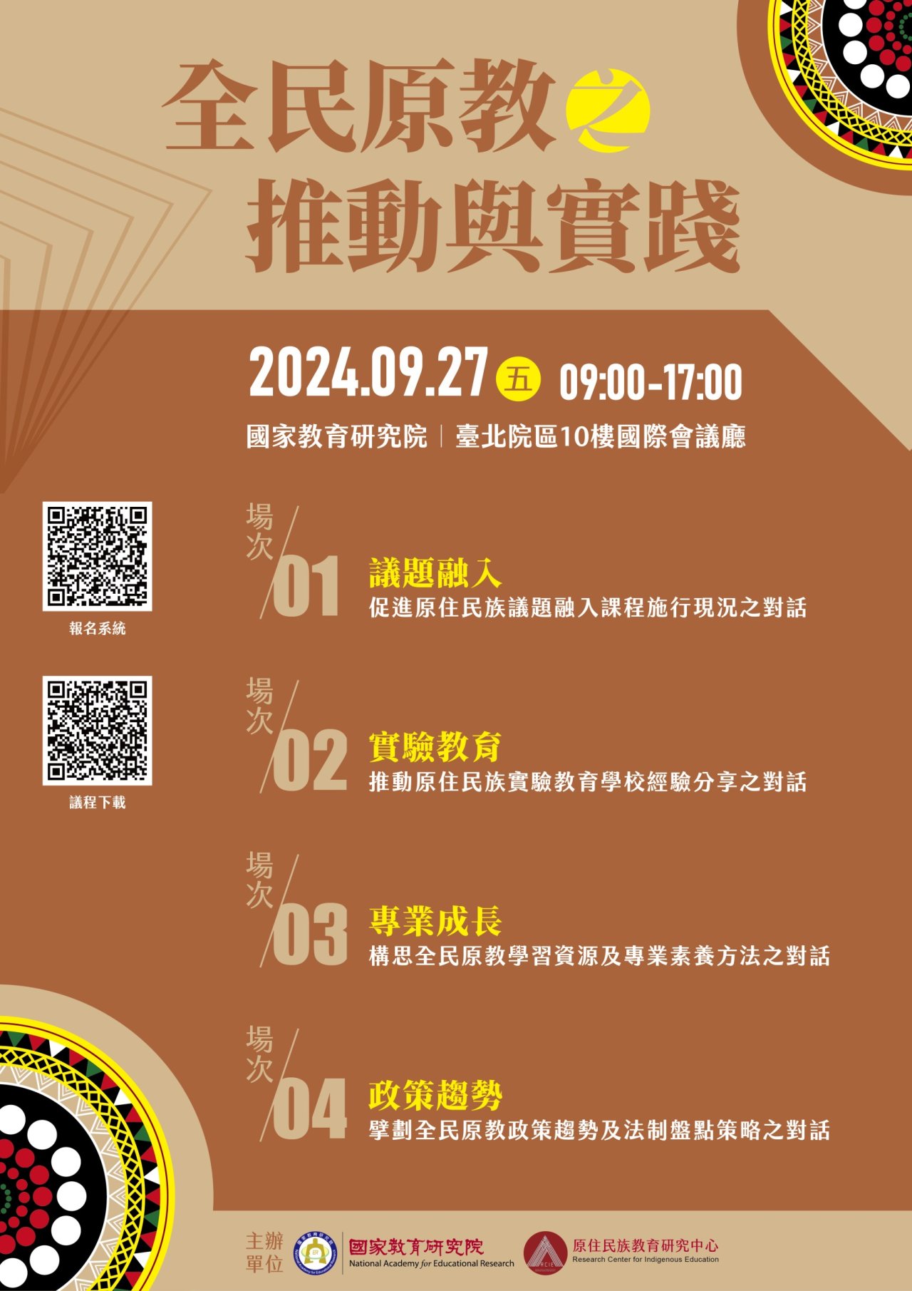 一、 | 本次研討會主題為「全民原教之推動與實踐」,邀請全民原教領域相關學者專家、長官、各級學校教育人員,以及對教育、教學、教材及課程發展有興趣的民眾,針對「議題融入-促進原住民族議題融入課程施行現況之對話」、「實驗教育-推動原住民族實驗教育學校經驗分享之對話」、「專業成長-構思全民原教學習資源及專業素養方法之對話」及「政策趨勢-擘劃全民原教政策趨勢及法制盤點策略之對話」等4項子題進行討論。 |