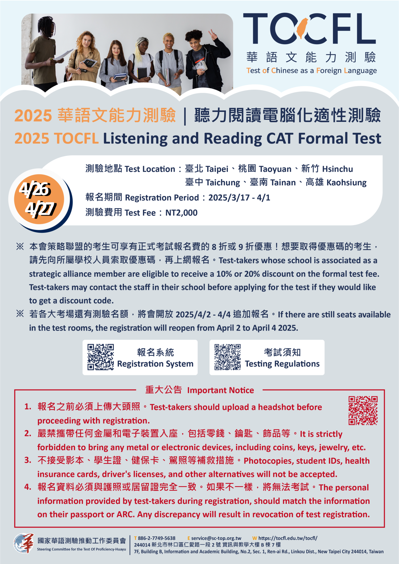 (二) | 測驗日期:114年4月26日至4月27日(星期六、星期日)聽讀測驗-電腦化適性測驗。 |