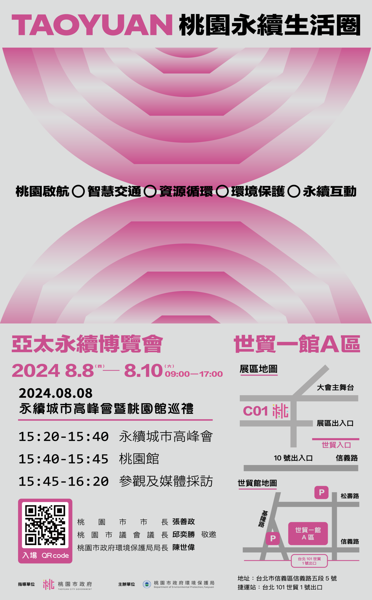 四、 本府蘇副市長俊賓於展期第一天(113年8月8日),受邀出席旨揭博覽會同期舉辦之「永續城市高峰會」,代表市府接受主辦單位頒發「台灣永續行動獎」,並將於高峰會中分享2050桃園淨零佈局。