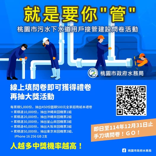一、 | 本府積極推動污水下水道建設,為透過民眾的回饋來檢討改進並提供更好的服務品質,爰此本局舉辦「就是要你管」問卷活動。 |