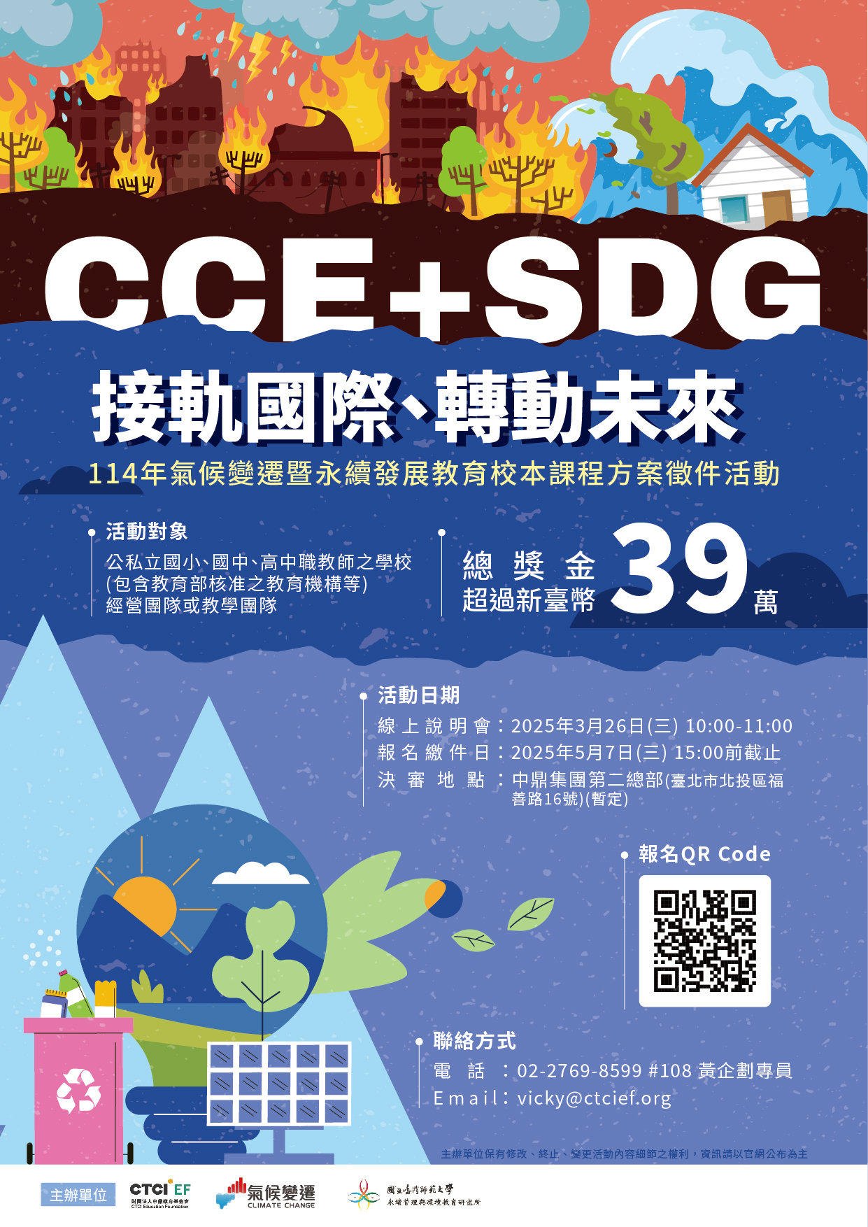 說明: 一、為強化我國各級教育人員對於氣候變遷教育(CCE, climate change education)、永續發展教育(ESD, education for sustainable development)與聯合國永續發展目標(SDGs)的認識,響應我國《氣候變遷因應法》對於氣候變遷教育的重新定位,與賴總統於國家氣候變遷對策委員會第三次會議之指示(https://www.president.gov.tw/News/39011),朝向「氣候變遷暨永續發展教育」(CCESD=CCE+ESD) 國際趨勢邁進,連結永續發展目標(SDGs)後,成為CCESDG。中鼎教育基金會(CTCIEF) 特與教育部氣候變遷教學資訊平臺氣候變遷教育推動計畫、國立臺灣師範大學永續管理與環境教育研究所共同籌辦旨揭徵件活動,以鼓勵教師研發「氣候變遷暨永續發展教案」。