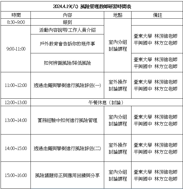 | 主旨: | 本中心辦理本市教師增能研習-「戶外安全風險管理評估及實作」課程,歡迎各級學校教師踴躍參與。 |