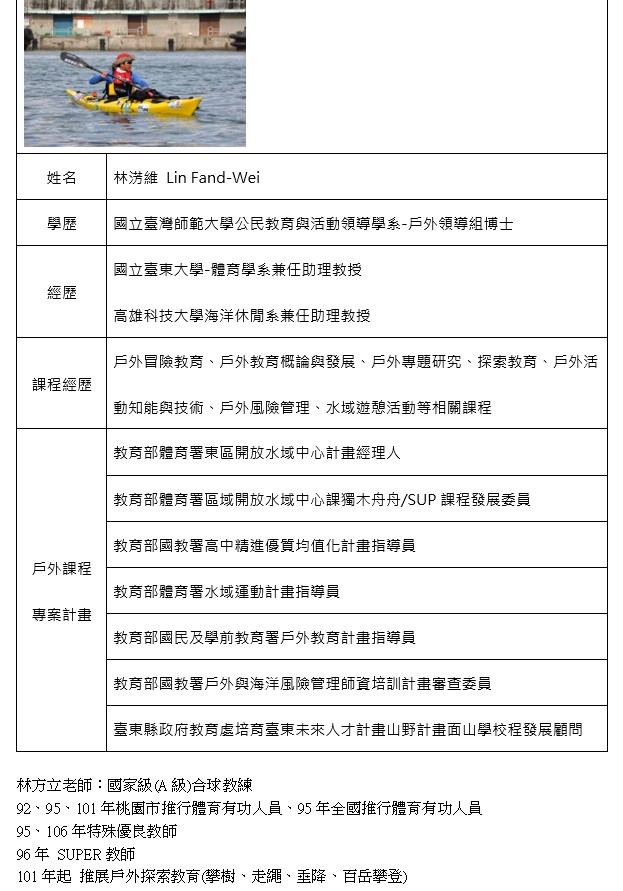 | (一) | 課程講師:林淓維老師(師大公領系戶外領導組博士,現任臺東大學助理教授);林方立老師(平興國中教師,國家級合球教練、全國推行體育有功及特殊優良教師) |
