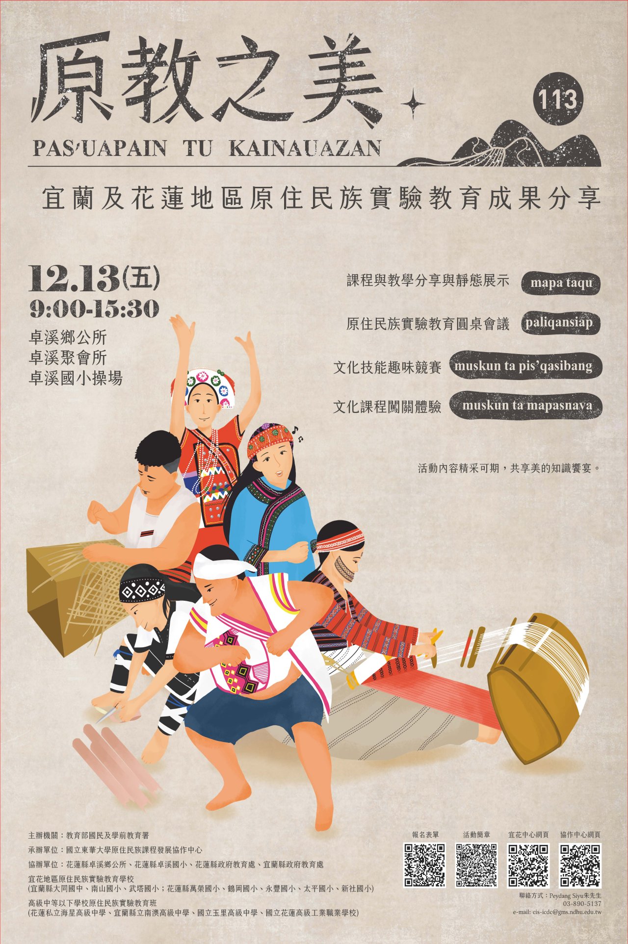 | 一、 | 活動係由宜蘭及花蓮地區原住民族實驗學校進行課程、教學與學生學習成果分享,並透過文化課程體驗活動之方式,期能促進與會人員對於原住民族實驗教育有更為深入之理解,盼創造聚焦、交流及多元對話的機會,提供相互參照與學習的平台。 |