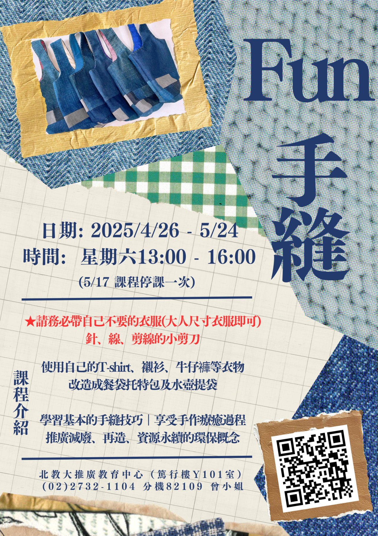 | 主旨: | 本校推廣教育中心辦理「Fun手縫(HandMay五月場)」縫紉課程招生訊息,鼓勵踴躍報名參加,請查照。 |