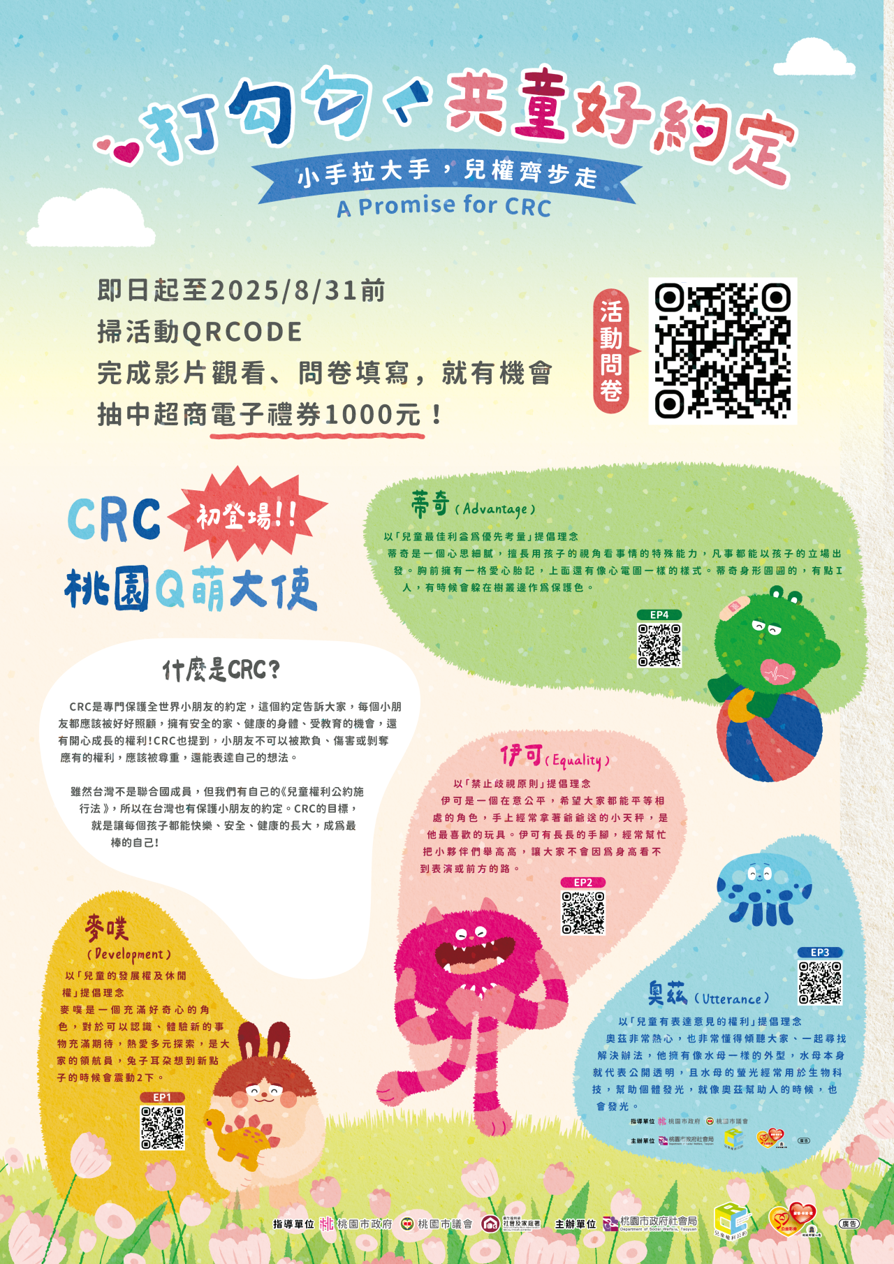 主旨: | 有關本市推廣宣傳兒童權利公約(以下簡稱CRC)活動一 案,請各單位協助於本市各場館電視牆或電子看板播放影片及於社群平台宣傳桃園Q萌大使推廣活動,詳如說明,請查照。 |