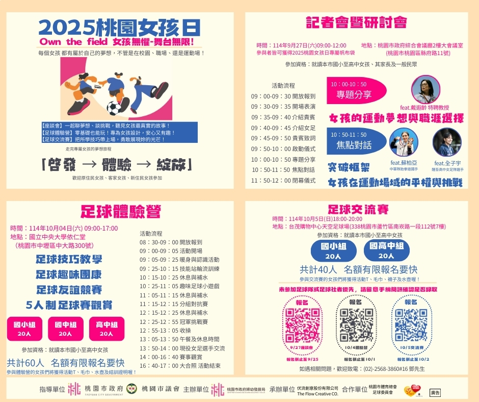 主旨: 檢送本局「2025桃園女孩日系列活動」之電子海報及跑馬燈文字稿,請惠予協助宣傳,並鼓勵本市公私立國小、國中及高中職女孩踴躍報名,請查照。