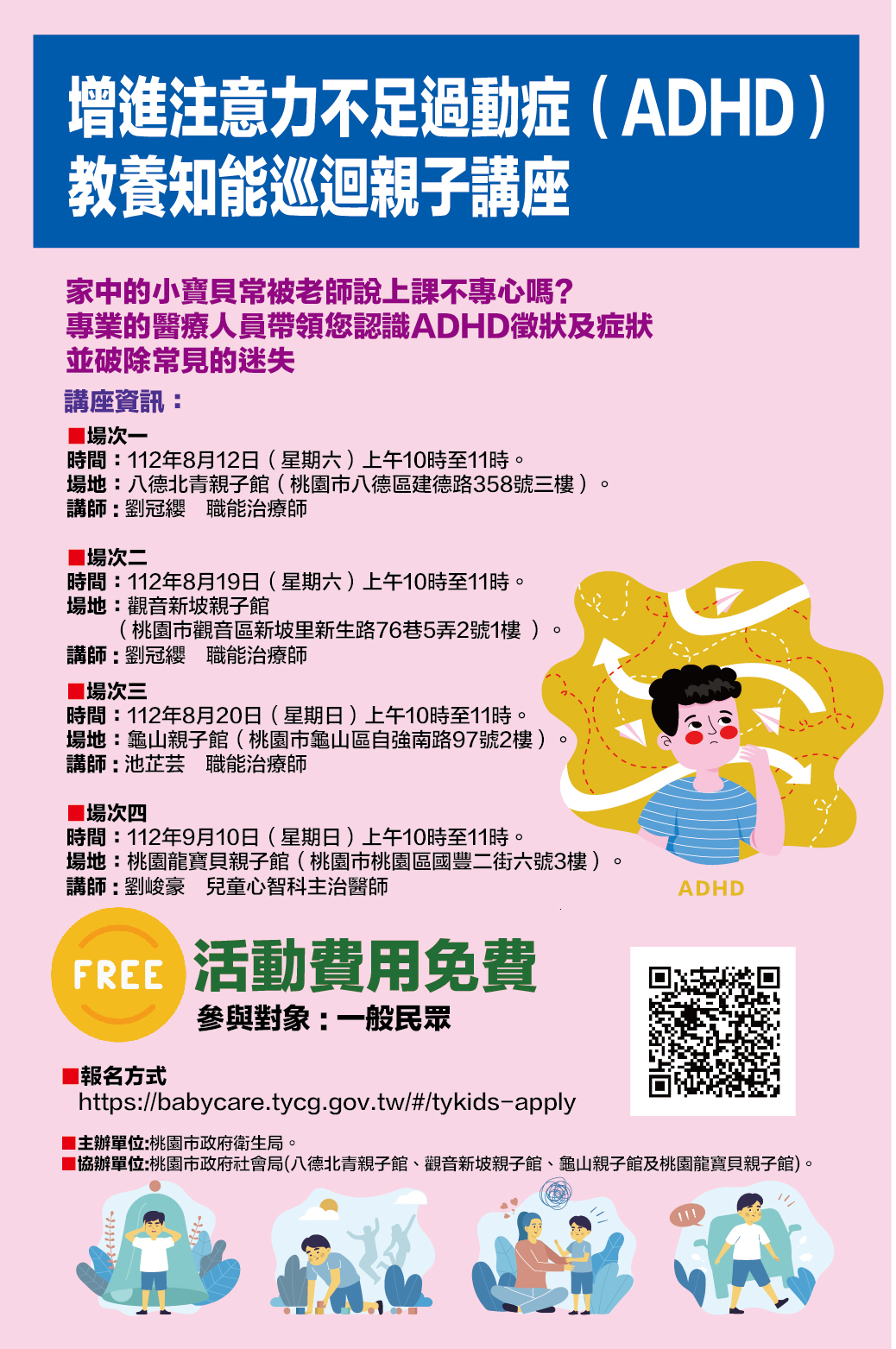 | 二、 | 注意力不足過動症(ADHD)是兒童期常見之神經發展障礙,為提升民眾及家長對注意力不足過動症(ADHD)之認識並知道如何尋求專業的協助,爰辦理旨案活動共計4場次,本次活動免費並採線上報名(https://babycare.tycg.gov.tw/#/tykids-apply)請各校廣為宣導,詳請參考附件計畫。 |