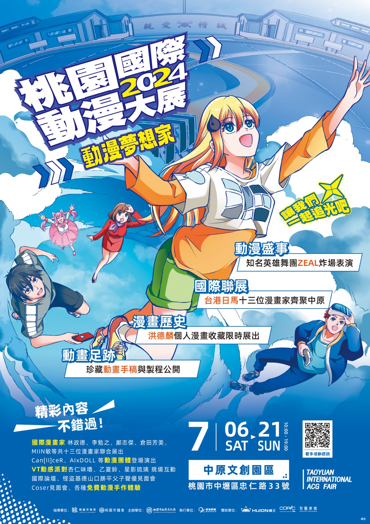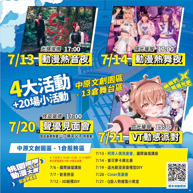 一、 | 「2024桃園國際動漫大展」訂於本(113)年7月6日至21日假中原文創園區辦理,今年主題為「動漫夢想家--讓我們一起追光吧!」,期透過精彩作品帶大家看見超越國界、跨越文化追求夢想的精神,沉浸在動漫迷人的光彩中,對生活保有做夢、追夢的能量,找到屬於自己的亮光。 |