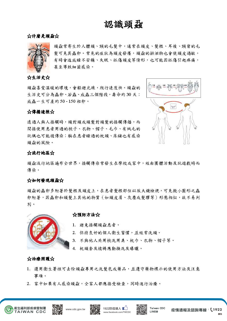 檢附「認識頭蝨」單張及「頭蝨的防治」各1份,詳如說明,請查照。