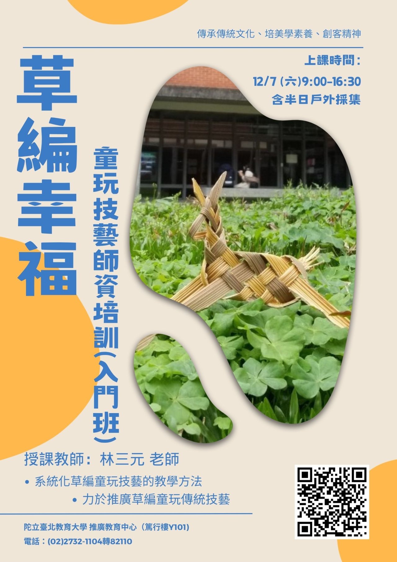 二、 | 草編幸福-童玩技藝師資培訓(進階班):113年12月14日(六)及12月15日(日)共9小時,全勤並通過評核將核發研習證明書。課程特聘專業草編達人「草編CEO林三元老師」親授,包含戶外採集、戶外與教室型態的教學示範、教學計劃撰寫、教學經驗分享等,歡迎18歲以上對草編童玩有興趣之教師或一般民眾報名。 |