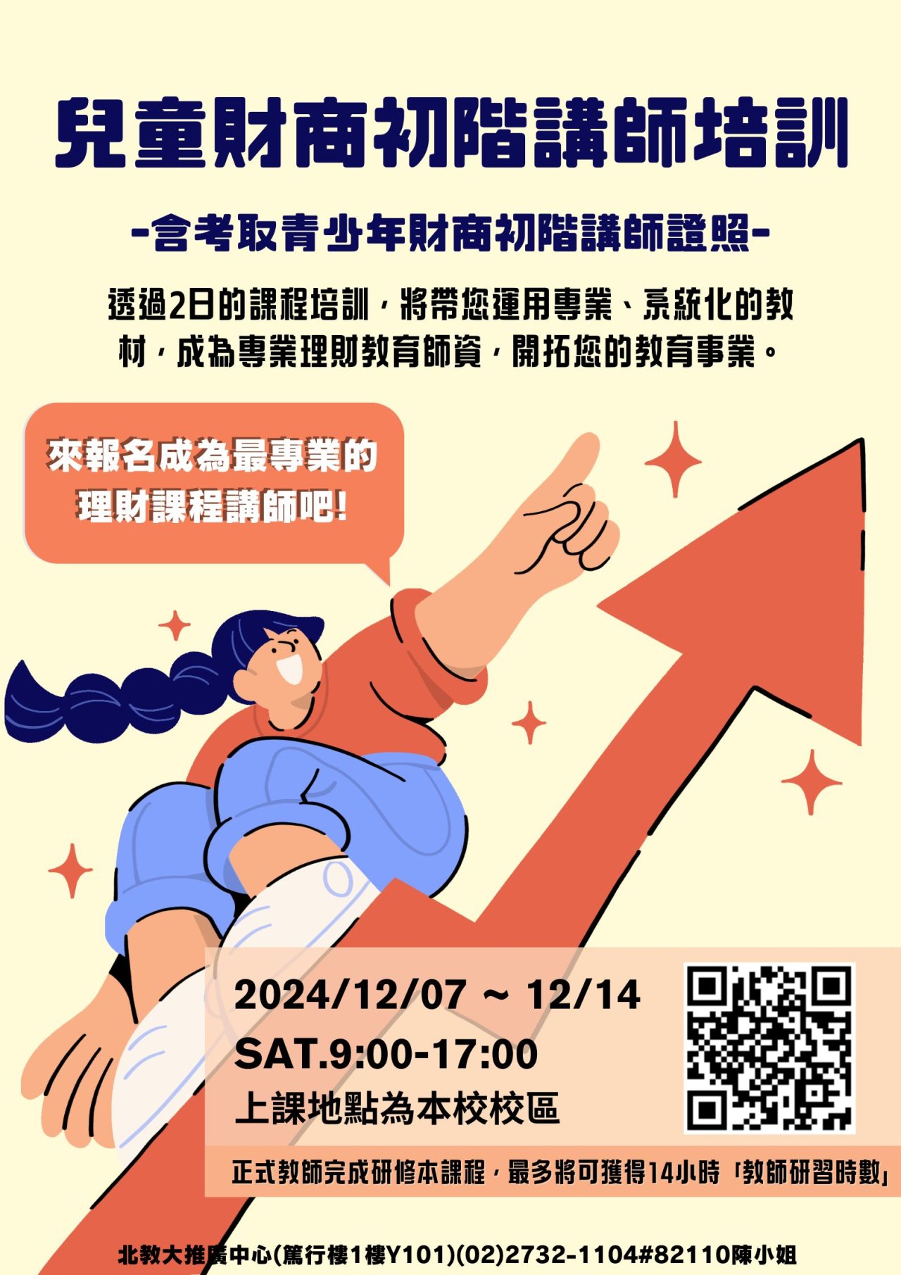 三、 | 兒童財商初階講師培訓班:113年12月7日、12月14日週六9:00-17:00共14小時,現場考取「青少年財商初階講師證照」。在學之大學生或研究生、教育及培訓機構教師、對「兒童財商教育」有興趣之社會人士皆可報名。 |