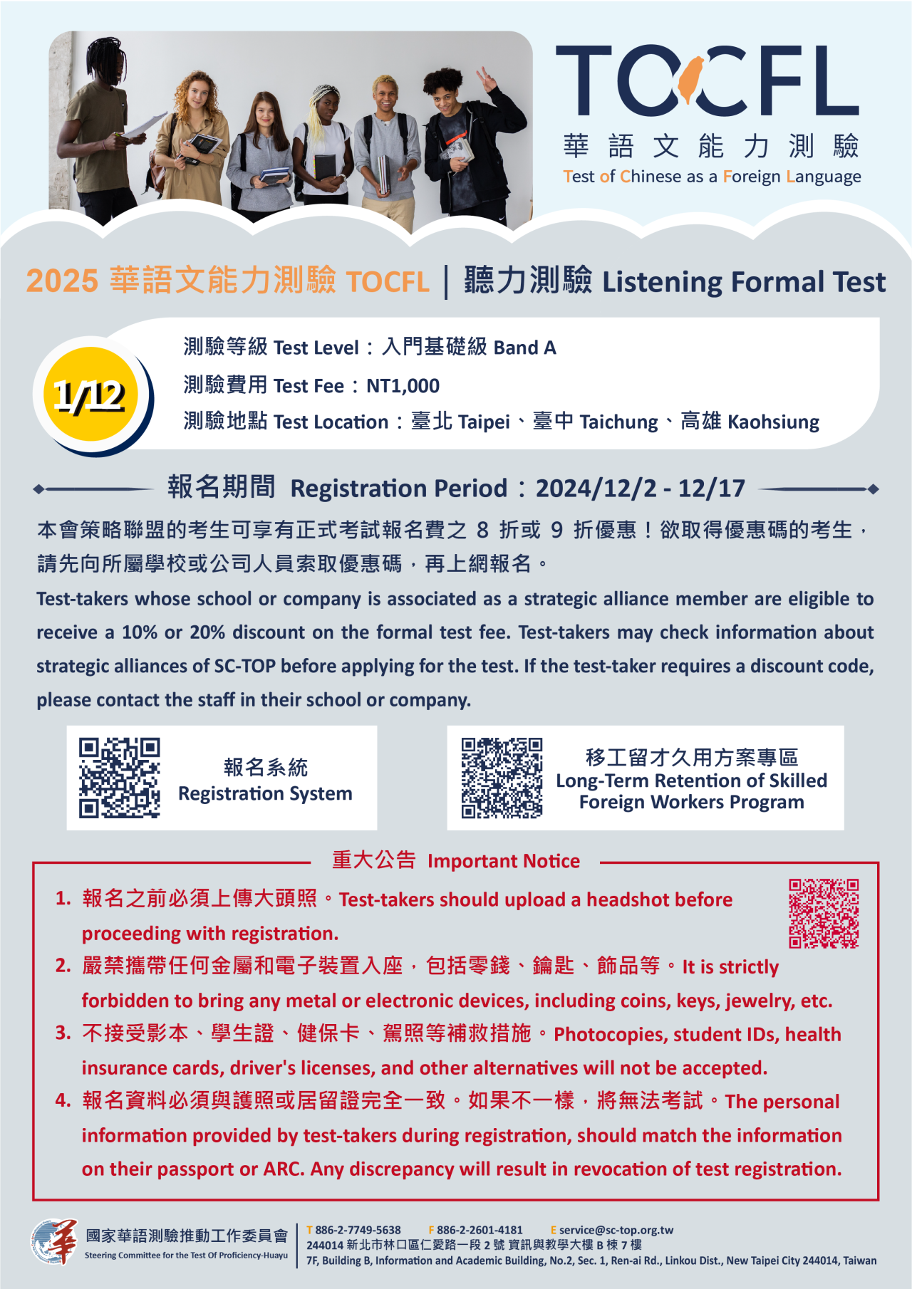 (二) | 114年11月12日(星期日):聽讀測驗-電腦化適性測驗、聽力測驗入門基礎級(移工留才久用方案)。 |
