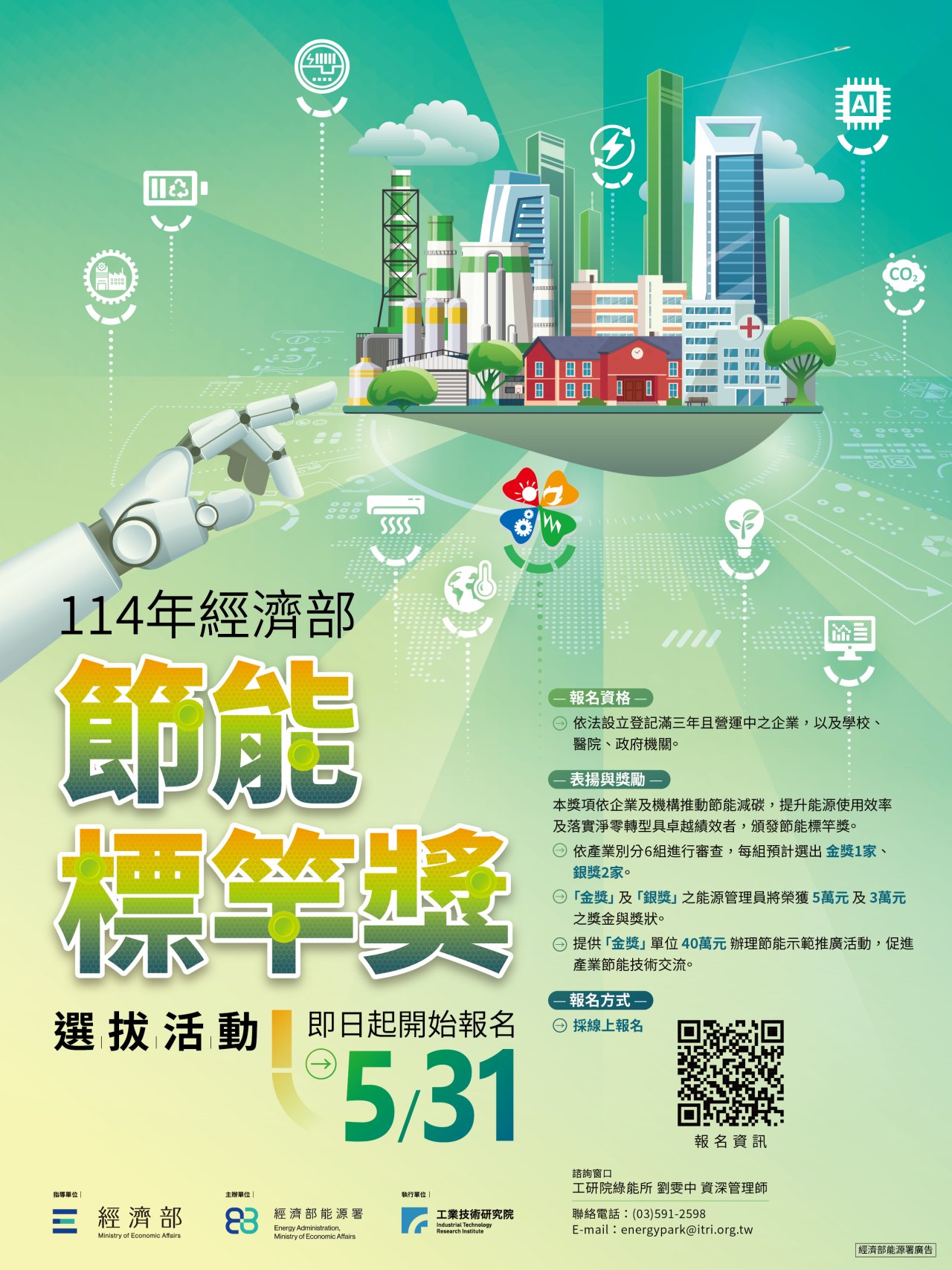 四、 | 檢送114年經濟部節能標竿獎選拔活動海報1份;本案聯絡窗口:工研院綠能所劉雯中資深管理師,電話:(03)591-2598,電子郵件:energypark@itri.org.tw。 |