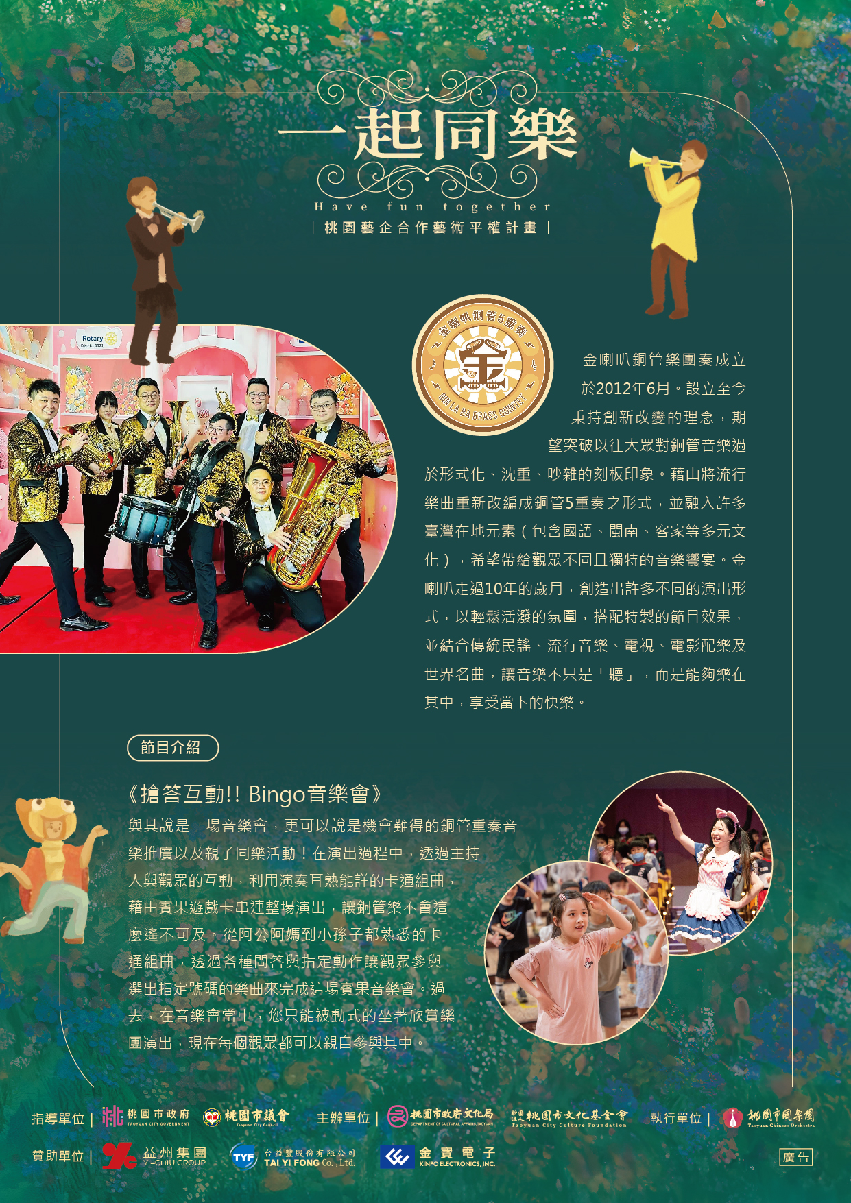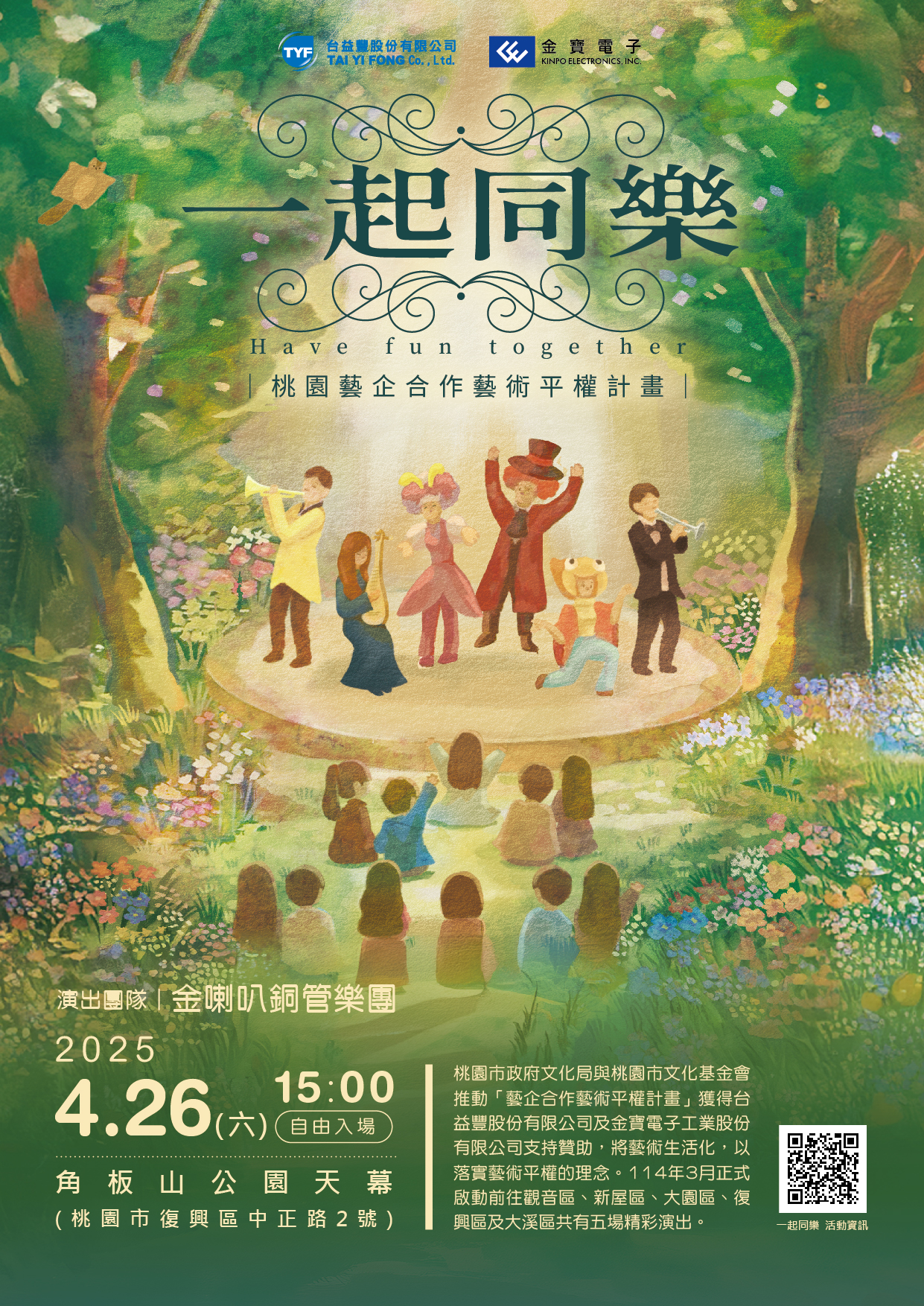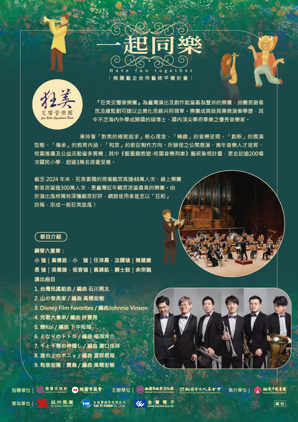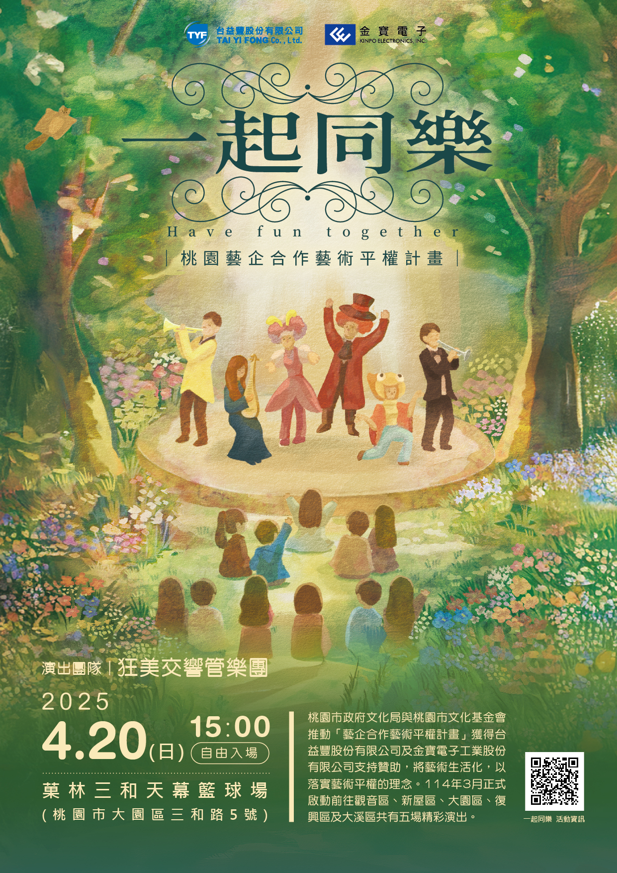 (一) | 114年4月20日(星期日)下午3時,邀請「狂美交響管樂團」於大園區菓林三和天幕籃球場(桃園市大園區三和路5號)辦理演出。 |
