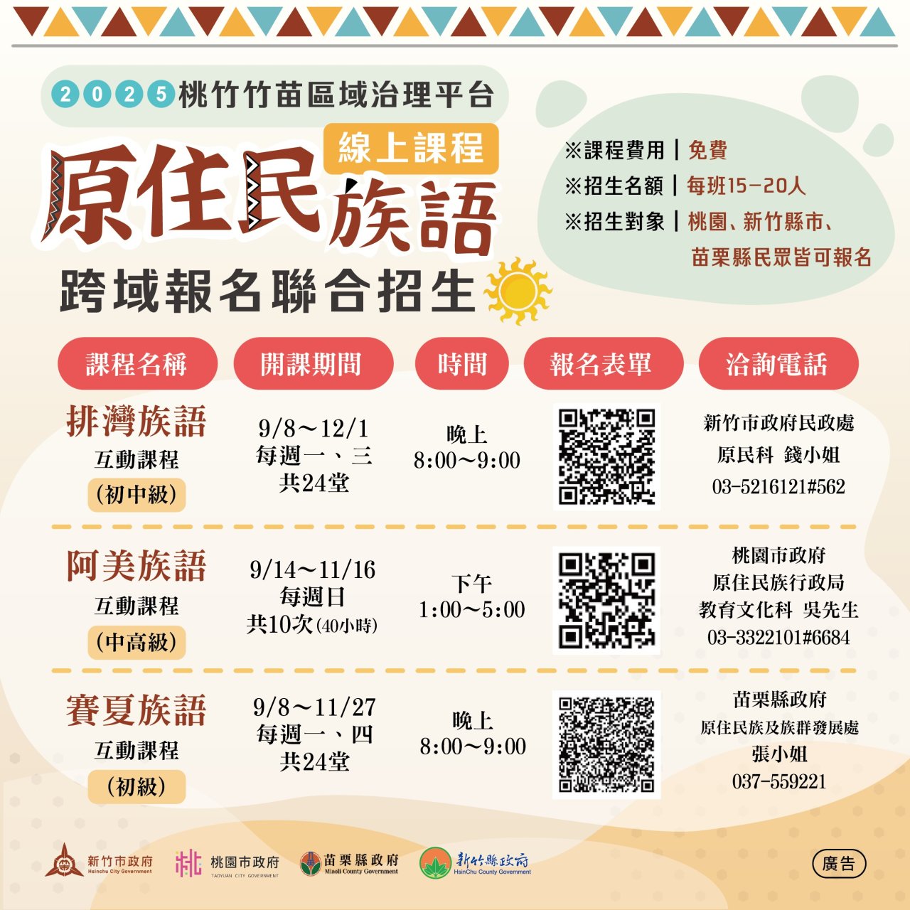 一、 | 為促進原住民族語學習資源共享與文化傳承,桃園市、新竹縣、新竹市及苗栗縣等四縣市政府攜手合作,整合原住民族語線上課程資源,推出「原住民族語線上課程聯合招生」計畫,開放四地民眾自由報名選修,突破區域與交通限制,實現族語學習「零距離」,有效提升學習便利性與參與率,促進資源共享並推動文化傳承。 |